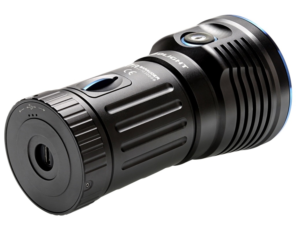 Latarka Olight X7R Marauder Cool White jest wodoodporna zgonie z normami IPX7. Użebrowana głowica pełni funkcję radiatora, który chroni latarkę i elektronikę przed przegrzaniem. Ładowanie odbywa się przy pomocy portu USB, który jest na spodzie latarki. Aby go odsłonić należy obrócić pierścień zgodnie z ruchem wskazówek zegara.
