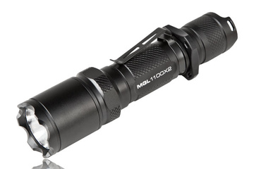 W skład zestawu wchodzą: latarka MGL 1100X2, dwie baterie CR123, klips oraz nylonowy pokrowiec.