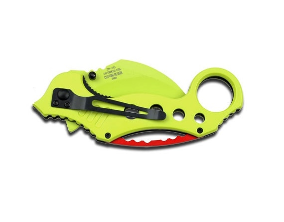 Taktyczna, składana wersja azjatyckiego noża karambit, który charakteryzuje się zakrzywionym, sierpowatym ostrzem oraz kółkiem na palec, gwarantującym pewny chwyt.