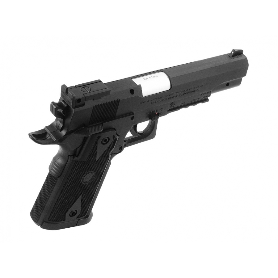 Pistolet wiatrówka Wingun WC4-304 B 4,5 mm (130-007) - to pistolet zbudowany na wzór Colta 1911. Korpus został wykonany z metalu, a całe pokrycie zewnętrzne z tworzywa ABS. Wiatrówka zasilana jest kapsułami CO2 o pojemności 12g, a jedna kapsuła pozwala na oddanie około 60 jednakowo silnych strzałów. Z kolei same pociski to stalowe śruciny BB’s (kaliber 4,46 mm) ulokowane w wyjmowanym i wykonanym z metalu magazynku 20 strzałowym. WinGun 304 dzięki sprawdzonej konstrukcji charakteryzuje się wysoką jakością wykonania i dużą celnością. Pistolet posiada manualny bezpiecznik chroniący przed przypadkowym wystrzałem. Pod lufą znajduje się szyna (szerokość 22 mm, weaver/picatinny) umożliwiająca montaż różnego rodzaju akcesoriów np. latarki czy lasera. Magazynek wyciągany jest od spodu, a tuż obok znajduje się komora na CO2 (pod wysuwaną okładziną rękojeści).