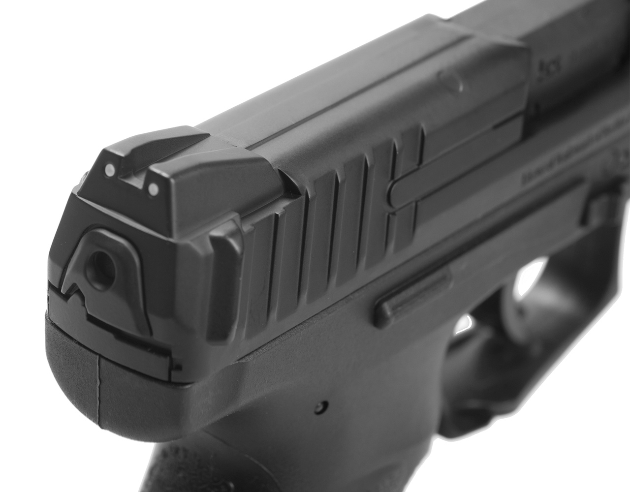 Wiatrówka Heckler&Koch VP9 (5.8344) zasilana CO2. Wykonana z metalu oraz trwałego polimeru. Korpus jest właśnie polimerowy, natomiast magazynek, ruchomy zamek oraz lufa pistoletu są metalowe jak w wersji bojowej. Na zamku wytłoczone są oryginalne oznaczenia producenta.